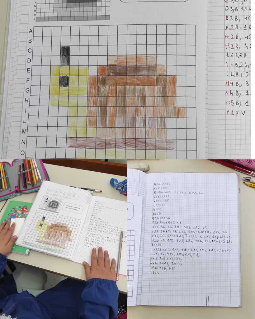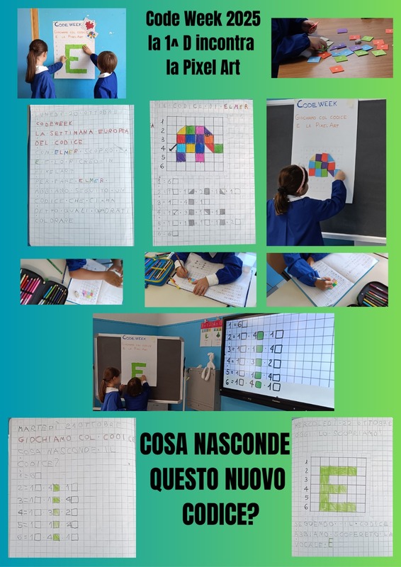 In occasione della Code Week, la classe 1^D incontra per la prima volta la Pixel Art. Usando una grande griglia con tasselli in gomma EVA, gli alunni scoprono cosa nascondono i vari codici.