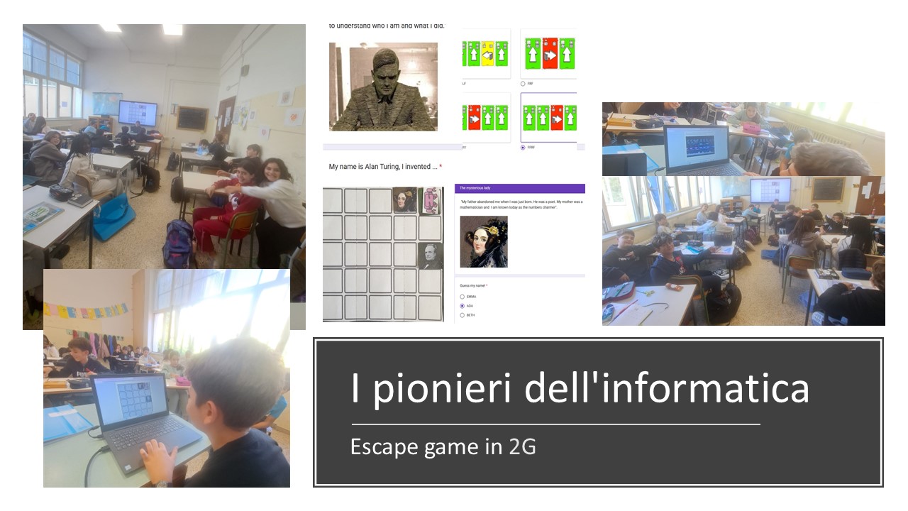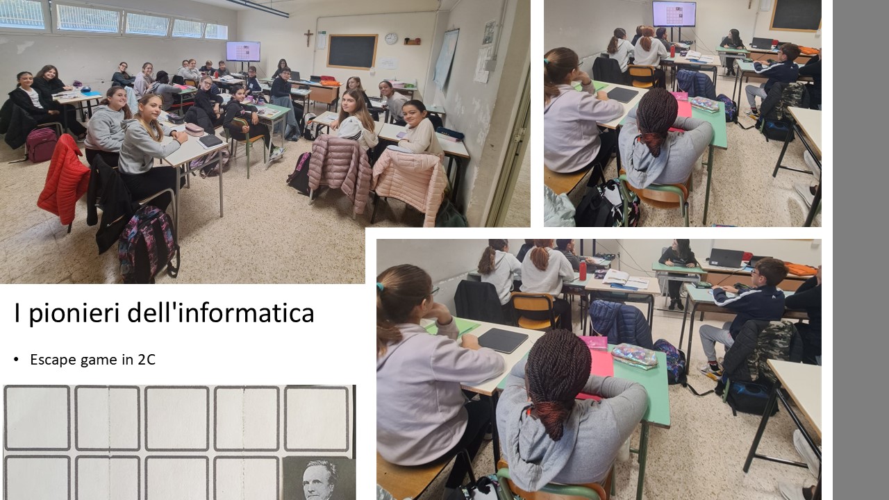 Le classi hanno partecipato a un Escape Game a tema “Pionieri dell’informatica”. In gruppo gli alunni hanno utilizzato una scacchiera di carta come ambiente di gioco e un segnalino (chiamato Roby) che funge da robot.