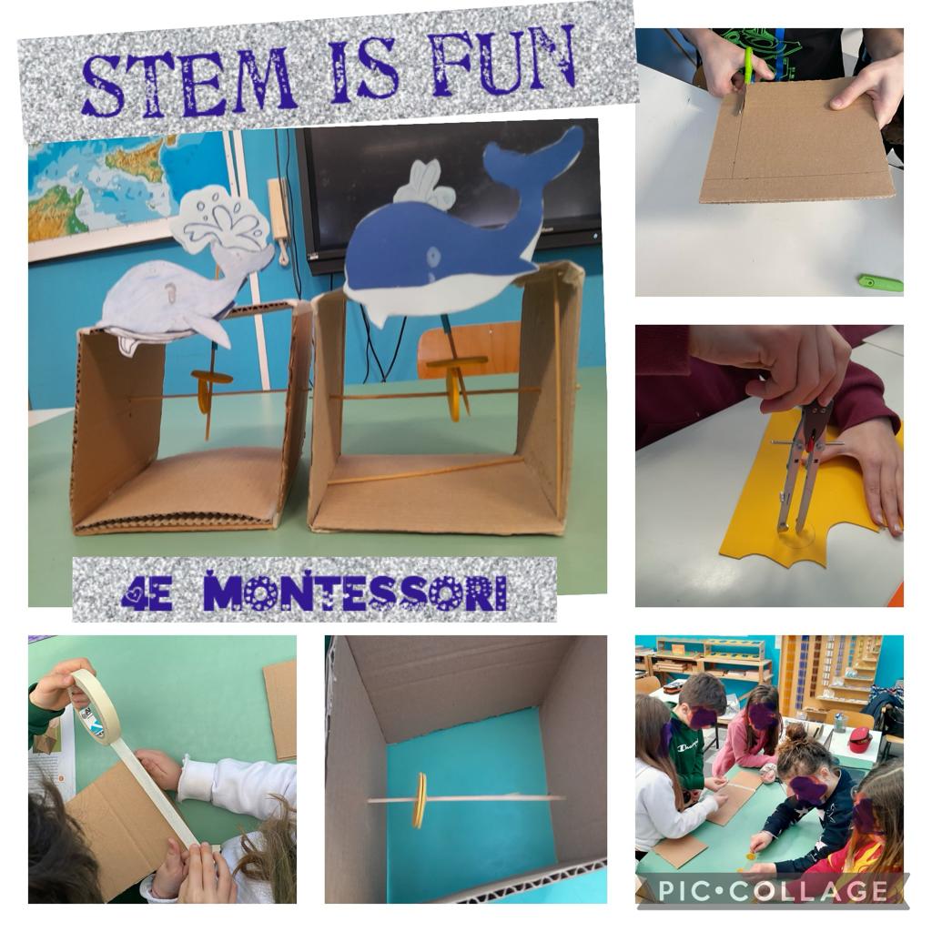 In occasione della settimana delle STEM, la classe 4 EM ha costruito un “Cardboard automata”. Il cardboard è in grado di riprodurre i movimenti di umani e animali. Gli alunni dopo aver realizzato l’automa di cartone hanno osservato che è la forza d’attrito che provoca il movimento dell’ingranaggio. Infatti, ruotando il bastoncino orizzontale si muove anche quello verticale e di conseguenza lo spruzzo d’acqua della balena.