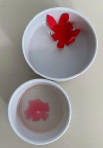 La capillarità dell’acqua. L’acqua penetra nei piccolissimi spazi presenti tra le fibre della carta che si gonfia , fa distendere le piegature e sbocciare il fiore rosso. L’olio non riesce a filtrare in questi spazi con il risultato che il fiore rosa non si è aperto .