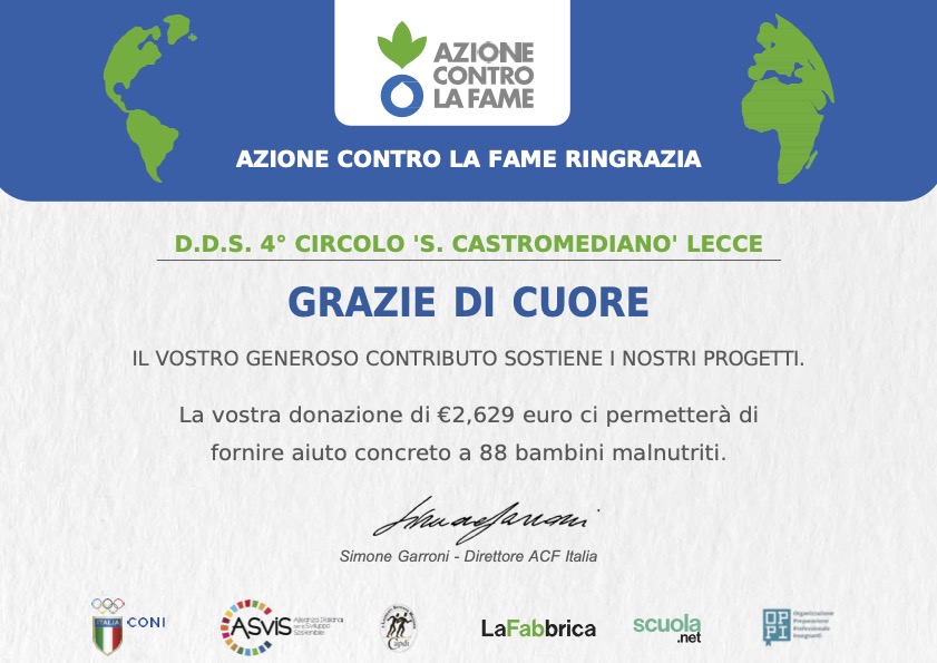 La lettera di ringraziamento alla nostra Scuola e alle Famiglie per l’impegno nel Progetto Corsa Contro la Fame.