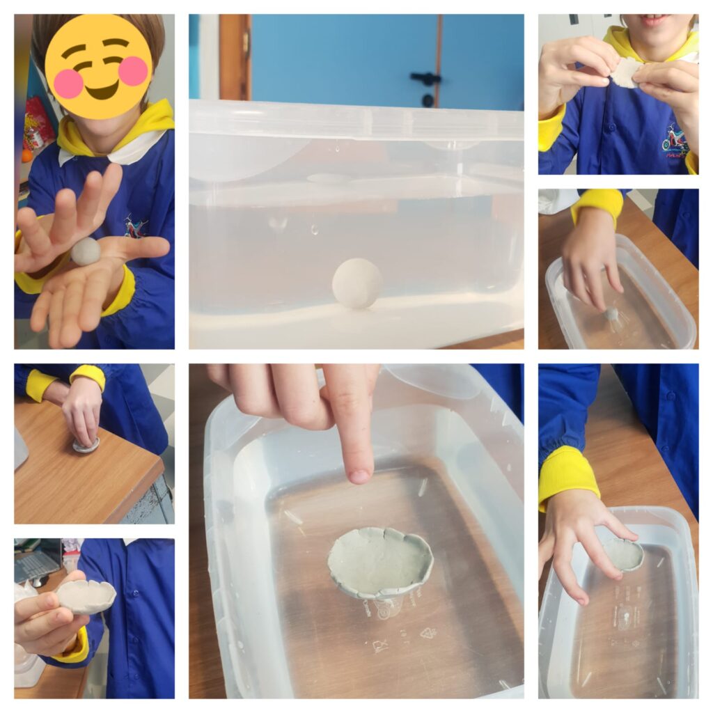 Gli alunni con una serie di esperimenti dimostrano che l’aria non ha una forma propria, ma occupa uno spazio, ha un peso, si lascia comprimere, è elastica, esercita una forza. Inoltre l’esperimento con la pallina e la barchetta di plastilina permette ai bambini di dimostrare il principio di Archimede: il galleggiamento dei corpi non dipende solo dal peso, ma anche dalla forma; infatti, quanto più spazio occupa un corpo, maggiore è la quantità di liquido che sposta, maggiore è la sua spinta verso l’alto.