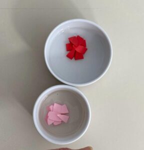 La capillarità dell’acqua. L’acqua penetra nei piccolissimi spazi presenti tra le fibre della carta che si gonfia , fa distendere le piegature e sbocciare il fiore rosso. L’olio non riesce a filtrare in questi spazi con il risultato che il fiore rosa non si è aperto .